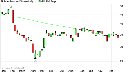 Mit dem Rücksetzer auf 33,80 EUR hat die ScanSource-Aktie am 23.12.2025 die 200-Tage-Linie nach unten gekreuzt.