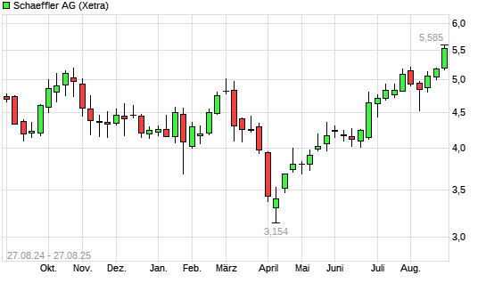 Mit dem Anstieg auf 5,34 EUR hat die Schaeffler-Aktie (ISIN DE000SHA0100) am 26.08.2025 ein neues 12-Monats-Hoch erreicht und damit den Kurs vom 25.08.2025 eingestellt.
