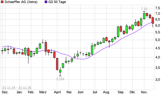 Mit dem Rücksetzer auf 6,02 EUR hat die Schaeffler-Aktie am 20.11.2025 die 50-Tage-Linie nach unten gekreuzt.