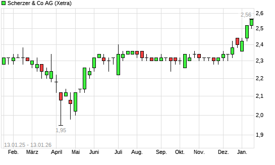 Mit dem Anstieg auf 2,48 EUR hat die Scherzer & Co.-Aktie (ISIN DE0006942808) am 12.01.2026 ein neues 12-Monats-Hoch erreicht und damit den Kurs vom 06.01.2026 eingestellt.