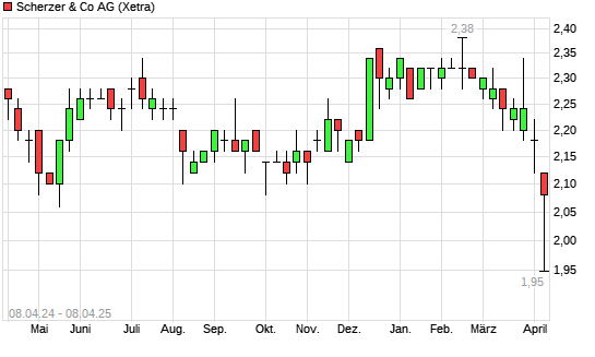 Mit dem Rücksetzer auf 2,04 EUR hat die Scherzer & Co.-Aktie (ISIN DE0006942808) am 07.04.2025 ein neues 6-Monats-Tief erreicht und damit den Kurs vom 08.10.2024 eingestellt.