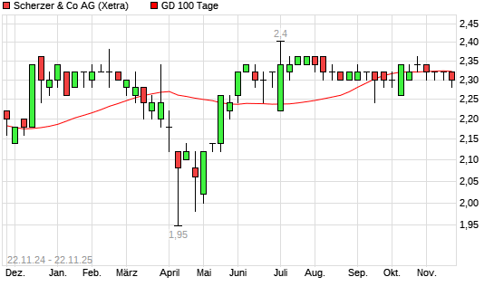 Mit dem Rücksetzer auf 2,28 EUR hat die Scherzer & Co.-Aktie am 21.11.2025 die 100-Tage-Linie nach unten gekreuzt.