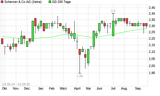 Mit dem Rücksetzer auf 2,24 EUR hat die Scherzer & Co.-Aktie am 22.09.2025 die 200-Tage-Linie nach unten gekreuzt.