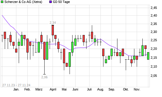 Mit dem Rücksetzer auf 2,12 EUR hat die Scherzer & Co.-Aktie am 26.11.2024 die 50-Tage-Linie nach unten gekreuzt.