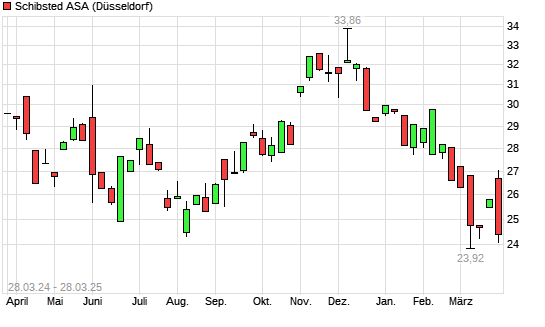 Mit dem Rücksetzer auf 24,12 EUR hat die Schibsted A-Aktie (ISIN NO0003028904) am 27.03.2025 ein neues 6-Monats-Tief erreicht und damit den Kurs vom 12.03.2025 eingestellt.