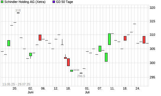 Mit dem Anstieg auf 305,00 EUR hat die Schindler Holding N-Aktie am 28.07.2025 die 50-Tage-Linie nach oben gekreuzt.