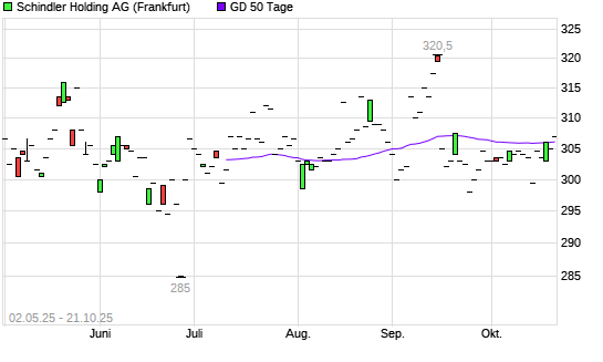 Mit dem Rücksetzer auf 305,00 EUR hat die Schindler Holding N-Aktie am 20.10.2025 die 50-Tage-Linie nach unten gekreuzt.