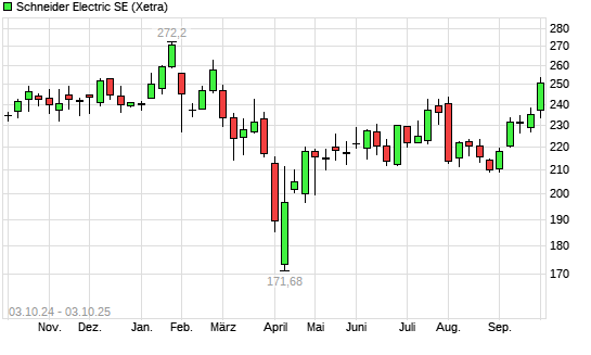 Mit dem Anstieg auf 251,05 EUR hat die Schneider Electric-Aktie (ISIN FR0000121972) am 02.10.2025 ein neues 6-Monats-Hoch erreicht und damit den Kurs vom 01.10.2025 eingestellt.