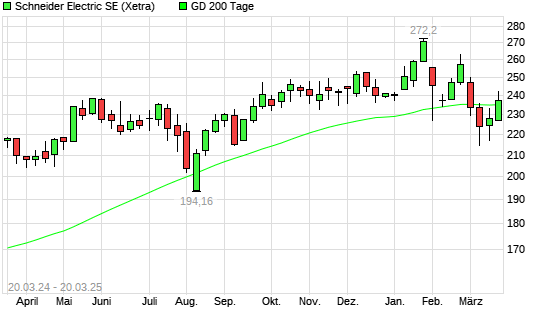 Mit dem Anstieg auf 243,10 EUR hat die Schneider Electric-Aktie am 19.03.2025 die 200-Tage-Linie nach oben gekreuzt.