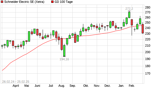 Mit dem Rücksetzer auf 240,65 EUR hat die Schneider Electric-Aktie am 24.02.2025 die 100-Tage-Linie nach unten gekreuzt.
