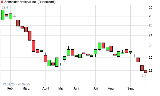 Mit dem Rücksetzer auf 17,70 EUR hat die Schneider National-Aktie (ISIN US80689H1023) am 29.09.2025 ein neues 3-Jahres-Tief erreicht und damit den Kurs vom 25.09.2025 eingestellt.
