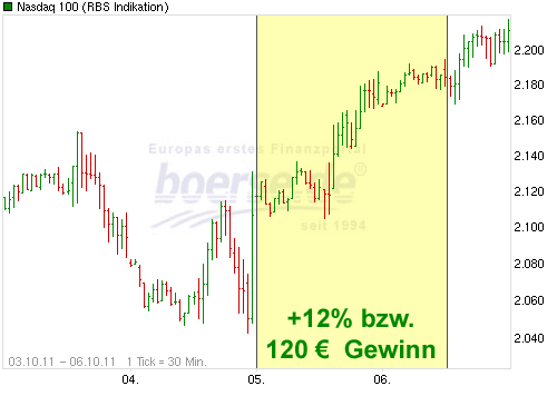 Die am 5. Oktober eingekauften Nasdaq100-Long-Zertifikate (WKN: DB8ND4) konnten mit schnellen Gewinnen von +12% wieder verkauft werden. Bei einem Einsatz von 1000 Euro hätten Sie somit satte 120 € an einem Tagen verdient. Sehen Sie selbst: