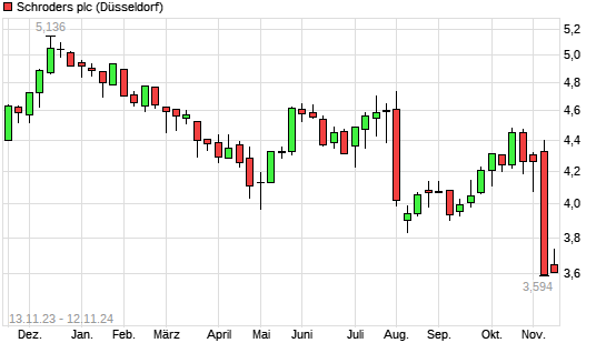Mit dem Rücksetzer auf 3,65 EUR hat die Schroders-Aktie (ISIN GB00BP9LHF23) am 11.11.2024 ein neues 10-Jahres-Tief erreicht und damit den Kurs vom 08.11.2024 eingestellt.