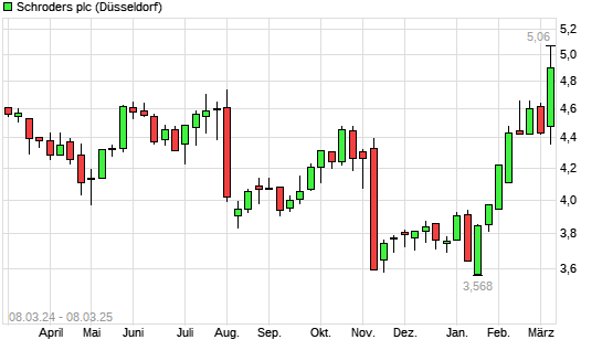 Mit dem Anstieg auf 5,07 EUR hat die Schroders-Aktie (ISIN GB00BP9LHF23) am 07.03.2025 ein neues 12-Monats-Hoch erreicht und damit den Kurs vom 03.06.2024 eingestellt.