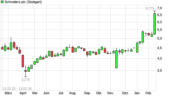 Mit dem Anstieg auf 6,75 EUR hat die Schroders-Aktie (ISIN GB00BP9LHF23) am 12.02.2026 ein neues 3-Jahres-Hoch erreicht und damit den Kurs vom 20.02.2023 eingestellt.