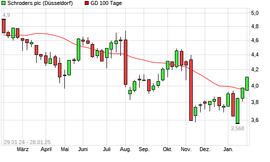 Mit dem Rücksetzer auf 3,95 EUR hat die Schroders-Aktie am 27.01.2025 die 100-Tage-Linie nach unten gekreuzt.