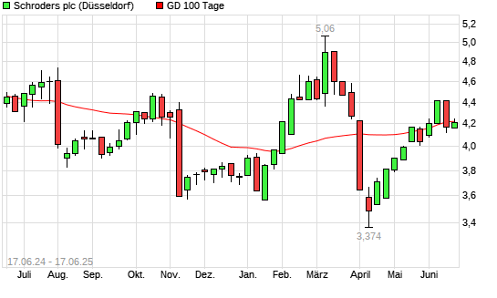 Mit dem Rücksetzer auf 4,18 EUR hat die Schroders-Aktie am 16.06.2025 die 100-Tage-Linie nach unten gekreuzt.