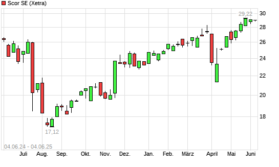 Mit dem Anstieg auf 28,98 EUR hat die Scor-Aktie (ISIN FR0010411983) am 03.06.2025 ein neues 12-Monats-Hoch erreicht und damit den Kurs vom 29.05.2025 eingestellt.