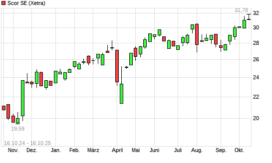 Mit dem Anstieg auf 31,68 EUR hat die Scor-Aktie (ISIN FR0010411983) am 15.10.2025 ein neues 12-Monats-Hoch erreicht und damit den Kurs vom 08.10.2025 eingestellt.