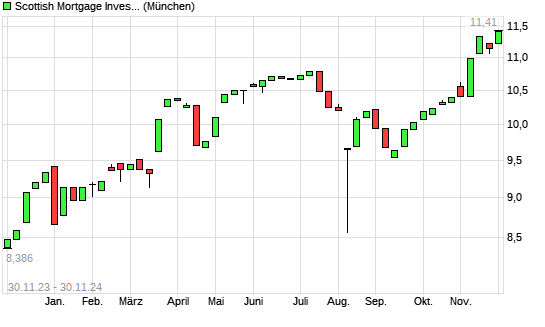 Mit dem Anstieg auf 11,52 EUR hat die Scottish Mortgage Investment-Aktie (ISIN GB00BLDYK618) am 29.11.2024 ein neues 12-Monats-Hoch erreicht und damit den Kurs vom 27.11.2024 eingestellt.
