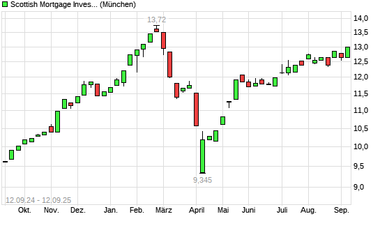 Mit dem Anstieg auf 12,94 EUR hat die Scottish Mortgage Investment-Aktie (ISIN GB00BLDYK618) am 11.09.2025 ein neues 6-Monats-Hoch erreicht und damit den Kurs vom 28.08.2025 eingestellt.