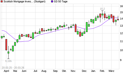 Mit dem Rücksetzer auf 13,96 EUR hat die Scottish Mortgage Investment-Aktie am 19.03.2026 die 50-Tage-Linie nach unten gekreuzt.