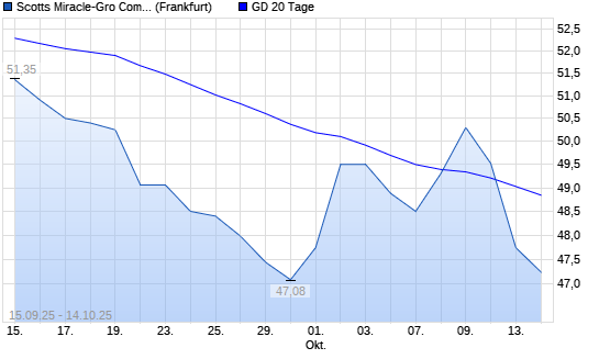 Mit dem Rücksetzer auf 47,74 EUR hat die Scotts Miracle Gro-Aktie am 13.10.2025 die 20-Tage-Linie nach unten gekreuzt.