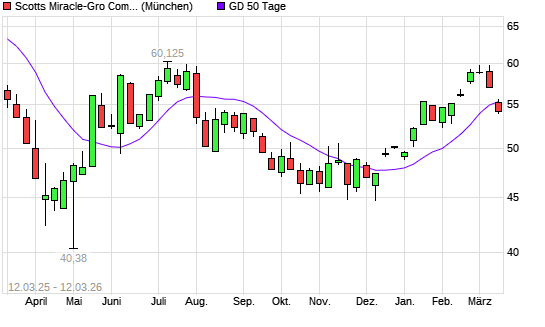 Mit dem Rücksetzer auf 54,35 EUR hat die Scotts Miracle Gro-Aktie am 11.03.2026 die 50-Tage-Linie nach unten gekreuzt.