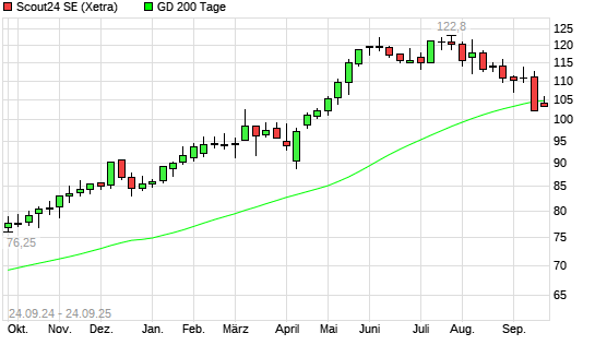 Mit dem Rücksetzer auf 104,70 EUR hat die Scout24-Aktie am 23.09.2025 die 200-Tage-Linie nach unten gekreuzt.