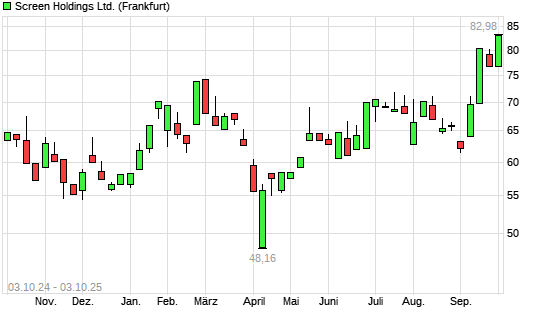 Mit dem Anstieg auf 82,78 EUR hat die Screen Holdings-Aktie (ISIN JP3494600004) am 02.10.2025 ein neues 12-Monats-Hoch erreicht und damit den Kurs vom 19.09.2025 eingestellt.
