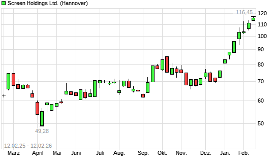 Mit dem Anstieg auf 115,30 EUR hat die Screen Holdings-Aktie (ISIN JP3494600004) am 11.02.2026 ein neues 12-Monats-Hoch erreicht und damit den Kurs vom 10.02.2026 eingestellt.
