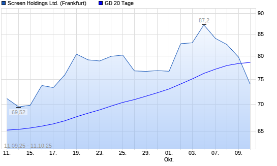 Mit dem Rücksetzer auf 74,02 EUR hat die Screen Holdings-Aktie am 10.10.2025 die 20-Tage-Linie nach unten gekreuzt.