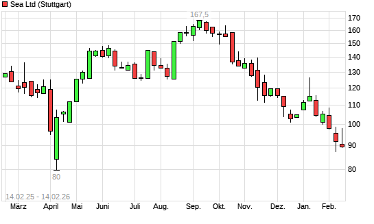 Mit dem Rücksetzer auf 89,40 EUR hat die Sea-Aktie (ISIN US81141R1005) am 13.02.2026 ein neues 12-Monats-Tief erreicht und damit den Kurs vom 04.02.2026 eingestellt.