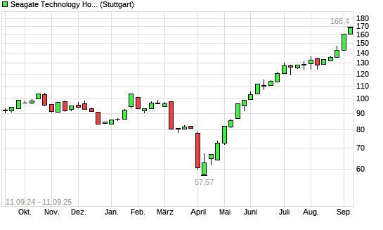 Mit dem Anstieg auf 163,86 EUR hat die Seagate Technology-Aktie (ISIN IE00BKVD2N49) am 10.09.2025 ein neues All-Time-High erreicht und damit den Kurs vom 09.09.2025 eingestellt.