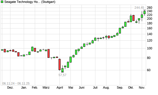 Mit dem Anstieg auf 244,50 EUR hat die Seagate Technology-Aktie (ISIN IE00BKVD2N49) am 05.11.2025 ein neues All-Time-High erreicht und damit den Kurs vom 30.10.2025 eingestellt.