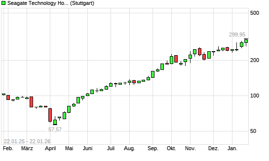 Mit dem Anstieg auf 296,50 EUR hat die Seagate Technology-Aktie (ISIN IE00BKVD2N49) am 21.01.2026 ein neues All-Time-High erreicht und damit den Kurs vom 06.01.2026 eingestellt.