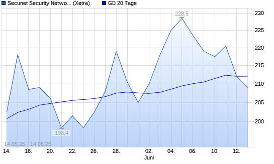 Mit dem Rücksetzer auf 208,50 EUR hat die Secunet Security Networks-Aktie am 13.06.2025 die 20-Tage-Linie nach unten gekreuzt.
