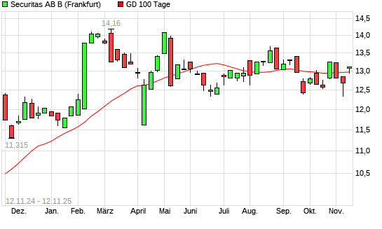 Mit dem Rücksetzer auf 12,94 EUR hat die Securitas B-Aktie am 11.11.2025 die 100-Tage-Linie nach unten gekreuzt.
