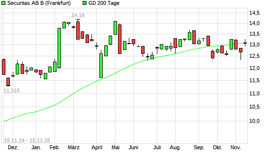 Mit dem Rücksetzer auf 13,09 EUR hat die Securitas B-Aktie am 14.11.2025 die 200-Tage-Linie nach unten gekreuzt.