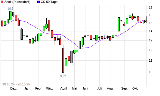 Mit dem Rücksetzer auf 15,40 EUR hat die Seek-Aktie am 29.10.2025 die 50-Tage-Linie nach unten gekreuzt.