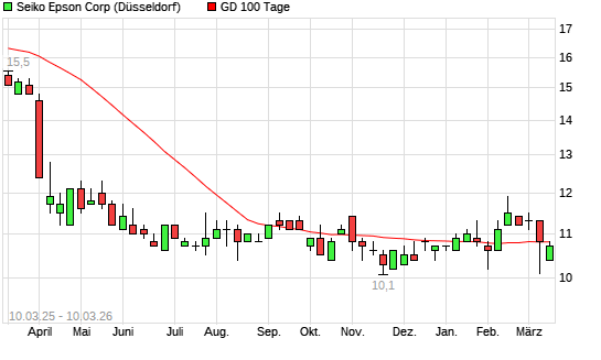 Mit dem Rücksetzer auf 10,60 EUR hat die Seiko Epson-Aktie am 09.03.2026 die 100-Tage-Linie nach unten gekreuzt.