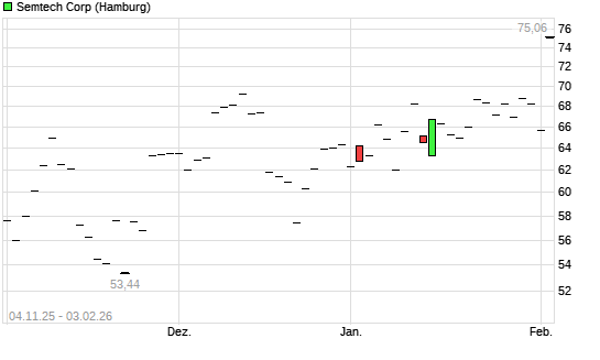Mit dem Anstieg auf 73,00 EUR hat die Semtech-Aktie (ISIN US8168501018) am 02.02.2026 ein neues 12-Monats-Hoch erreicht und damit den Kurs vom 22.01.2026 eingestellt.