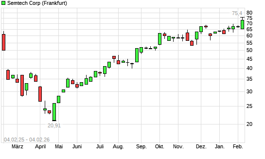 Mit dem Anstieg auf 75,40 EUR hat die Semtech-Aktie (ISIN US8168501018) am 03.02.2026 ein neues 12-Monats-Hoch erreicht und damit den Kurs vom 02.02.2026 eingestellt.