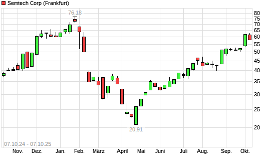 Mit dem Anstieg auf 62,22 EUR hat die Semtech-Aktie (ISIN US8168501018) am 06.10.2025 ein neues 6-Monats-Hoch erreicht und damit den Kurs vom 03.10.2025 eingestellt.
