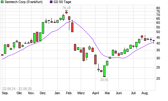 Mit dem Anstieg auf 41,28 EUR hat die Semtech-Aktie am 21.08.2025 die 50-Tage-Linie nach oben gekreuzt.