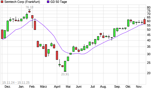 Mit dem Rücksetzer auf 56,74 EUR hat die Semtech-Aktie am 14.11.2025 die 50-Tage-Linie nach unten gekreuzt.