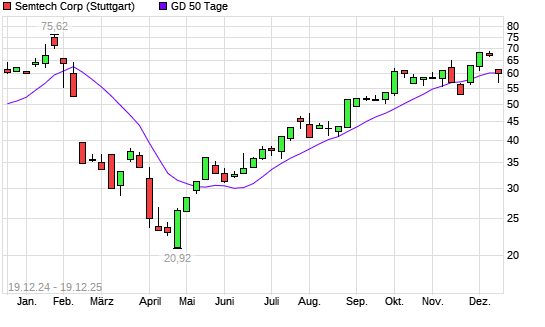 Mit dem Rücksetzer auf 56,86 EUR hat die Semtech-Aktie am 18.12.2025 die 50-Tage-Linie nach unten gekreuzt.