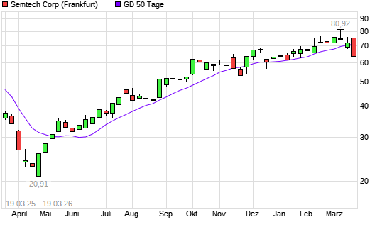 Mit dem Rücksetzer auf 69,68 EUR hat die Semtech-Aktie am 18.03.2026 die 50-Tage-Linie nach unten gekreuzt.