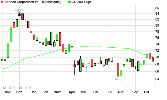 Mit dem Rücksetzer auf 69,16 EUR hat die Service Corporation International-Aktie am 17.10.2025 die 200-Tage-Linie nach unten gekreuzt.