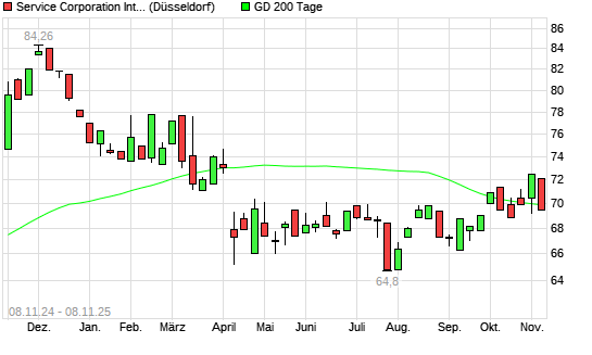 Mit dem Rücksetzer auf 69,36 EUR hat die Service Corporation International-Aktie am 07.11.2025 die 200-Tage-Linie nach unten gekreuzt.